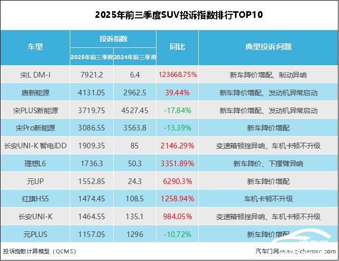 汽车门网近日公布2025年前三季度投诉指数,SUV投诉榜单也正式对外发布。多个方面数据显示,2025年前三季度SUV的投诉指数为72656.8,同比增长35.26%。比亚迪旗下的宋L DM- i、唐新能源、宋PLUS新能源、宋Pro新能源、元UP、元PLUS等六款车型均因新车降价增配问题登上2025年前三季度SUV投诉指数排行TOP10。据悉,比亚迪于今年2月10日宣布为新款车新增“天眼之神”智驾系统,而老款车却没办法升级到新功能,点燃了老车主的怒火,导致比亚迪旗下多款SUV在今年2-3月的投诉指数激增。此外,长安汽车旗下的长安UNI-K 智电iDD和长安UNI-K因变速箱顿挫异响和车机卡顿不升级问题引发车主集中投诉。此外,理想L6和红旗HS5也登上榜单。