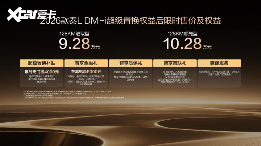 限时权益叠加,重塑家轿价值底线款秦L DM-i上市,共2款车型,包括128KM进取型和128KM领先型,官方指导价9.68-10.68万元。除极具竞争力的售价外,比亚迪同步推出多重购车福利。2025年11月30日前完成开票,就可以享受4000元无门槛置换补贴,让购车门槛进一步降低。